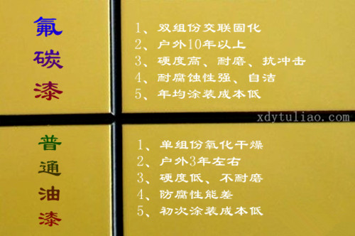 氟碳漆與普通漆有什么區別? 本文從一下幾個方面全面的比較了氟碳漆與普通漆的區別比較:樹脂、固化成膜、耐候性、機械性能、耐溶劑性能、耐熱性、使用期限、市場價、可涂布面積、每平米每年的成本