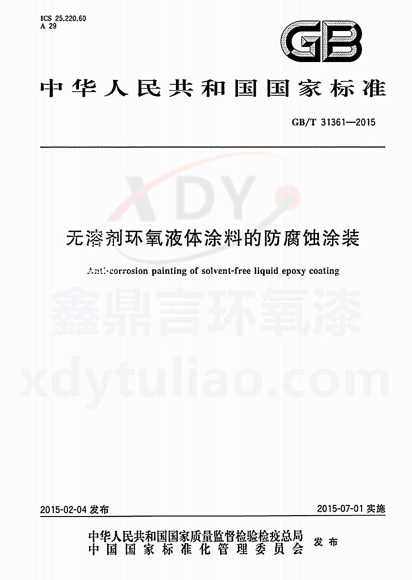 GB/T 31361-2015無溶劑環(huán)氧液體涂料的防腐蝕涂裝標(biāo)準(zhǔn) ICS25.220.60 A29 GB 中華人民共和國國家標(biāo)準(zhǔn) GB/T 31361-2015 無溶劑環(huán)氧液體涂料的防腐蝕涂裝anti-corrosion painting of solvent-free liquid epoxy coating 2015-02-04發(fā)布 2015-07-01實(shí)施 中華人民共和國國家質(zhì)量監(jiān)督檢驗(yàn)檢